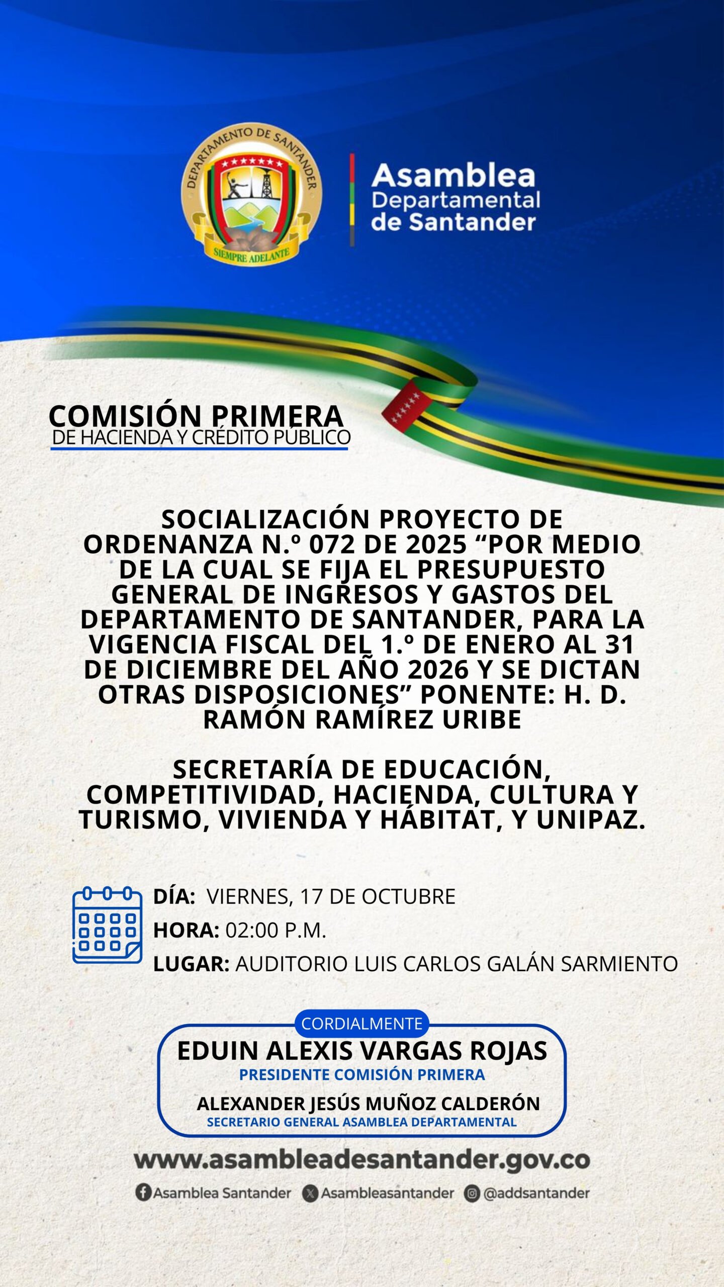 La Comisión Primera de Hacienda y Crédito Público de la Asamblea Departamental de Santander invita a la socialización del Proyecto de Ordenanza N.º 072 de 2025, “por medio de la cual se fija el presupuesto general de ingresos y gastos del Departamento de Santander para la vigencia fiscal del 1.º de enero al 31 de diciembre de 2026 y se dictan otras disposiciones”. El encuentro, con la ponencia del diputado Ramón Ramírez Uribe, contará con la participación de las Secretarías de Educación, Competitividad, Hacienda, Cultura y Turismo, Vivienda y Hábitat, y UNIPAZ. La jornada se realizará el viernes 17 de octubre a las 2:00 p. m. en el Auditorio Luis Carlos Galán Sarmiento.