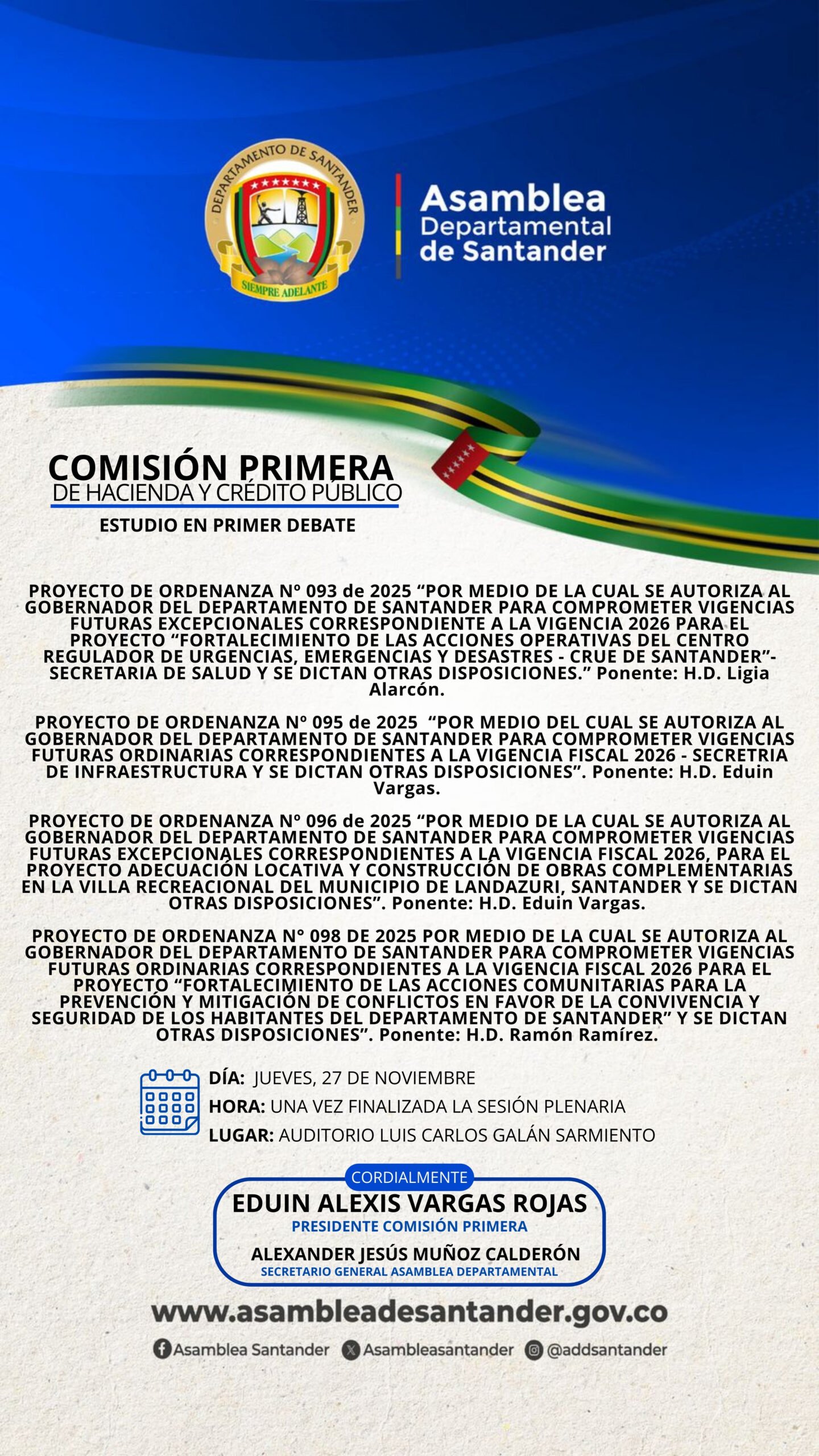 La Comisión Primera de Hacienda y Crédito Público de la Asamblea Departamental de Santander invita al estudio en primer debate de los Proyectos de Ordenanza 093, 095, 096 y 098 de 2025, relacionados con la autorización de vigencias futuras para fortalecer acciones en salud, infraestructura, obras complementarias y programas de prevención y seguridad en el departamento. La sesión se realizará el jueves 27 de noviembre, una vez finalice la sesión plenaria, en el auditorio Luis Carlos Galán Sarmiento.