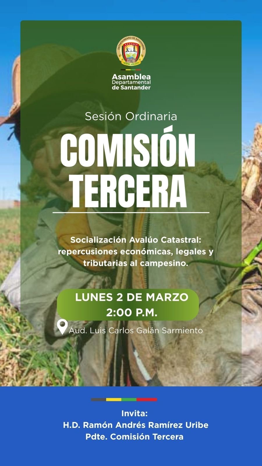 La Asamblea Departamental de Santander invita a la Sesión Ordinaria de la Comisión Tercera, donde se realizará la socialización del avalúo catastral y sus repercusiones económicas, legales y tributarias para el campesino. El encuentro se llevará a cabo el lunes 2 de marzo a las 2:00 p.m. en el Auditorio Luis Carlos Galán Sarmiento. Invitación realizada por el H.D. Ramón Andrés Ramírez Uribe, presidente de la Comisión Tercera. Su participación es fundamental para construir soluciones que protejan al campo santandereano.
