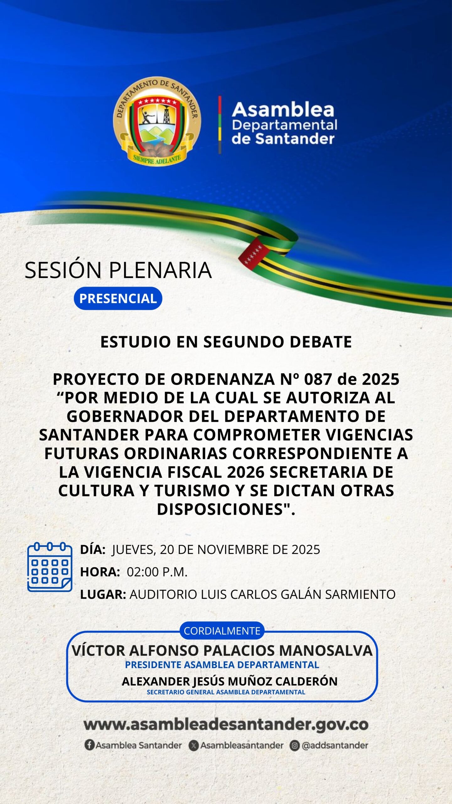 La Asamblea Departamental de Santander invita a la comunidad a participar de manera presencial en la sesión plenaria donde se realizará el estudio en segundo debate del Proyecto de Ordenanza N.º 087 de 2025, mediante el cual se autoriza al Gobernador de Santander a comprometer vigencias futuras ordinarias correspondientes a la vigencia fiscal 2026 para la Secretaría de Cultura y Turismo. La cita es este jueves 20 de noviembre de 2025, a las 2:00 p. m., en el Auditorio Luis Carlos Galán Sarmiento. ¡Los esperamos!