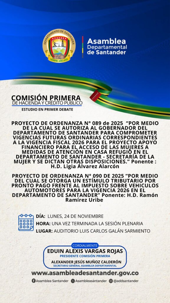 La Asamblea Departamental de Santander invita a la ciudadanía a la sesión plenaria presencial que se llevará a cabo el lunes 24 de noviembre de 2025 a las 7:30 a.m. en el Auditorio Luis Carlos Galán Sarmiento, donde se realizará el estudio en segundo debate del Proyecto de Ordenanza N.° 087 de 2025, relacionado con vigencias futuras para la Secretaría de Cultura y Turismo, y del Proyecto de Ordenanza N.° 066 de 2025, mediante el cual se adopta la celebración del Día Internacional de la Juventud y se institucionaliza la Semana de la Juventud en Santander.