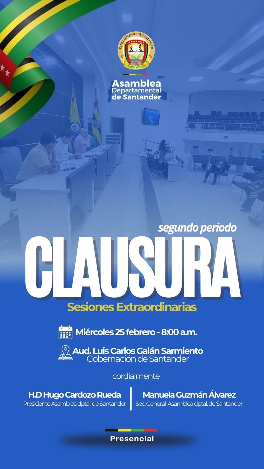 La Asamblea Departamental de Santander invita a la comunidad a la clausura del segundo periodo de sesiones extraordinarias, que se realizará de manera presencial el miércoles 25 de febrero a las 8:00 a.m. en el Auditorio Luis Carlos Galán Sarmiento de la Gobernación de Santander, un espacio institucional donde se presentará el balance del trabajo realizado y los avances en beneficio del departamento.