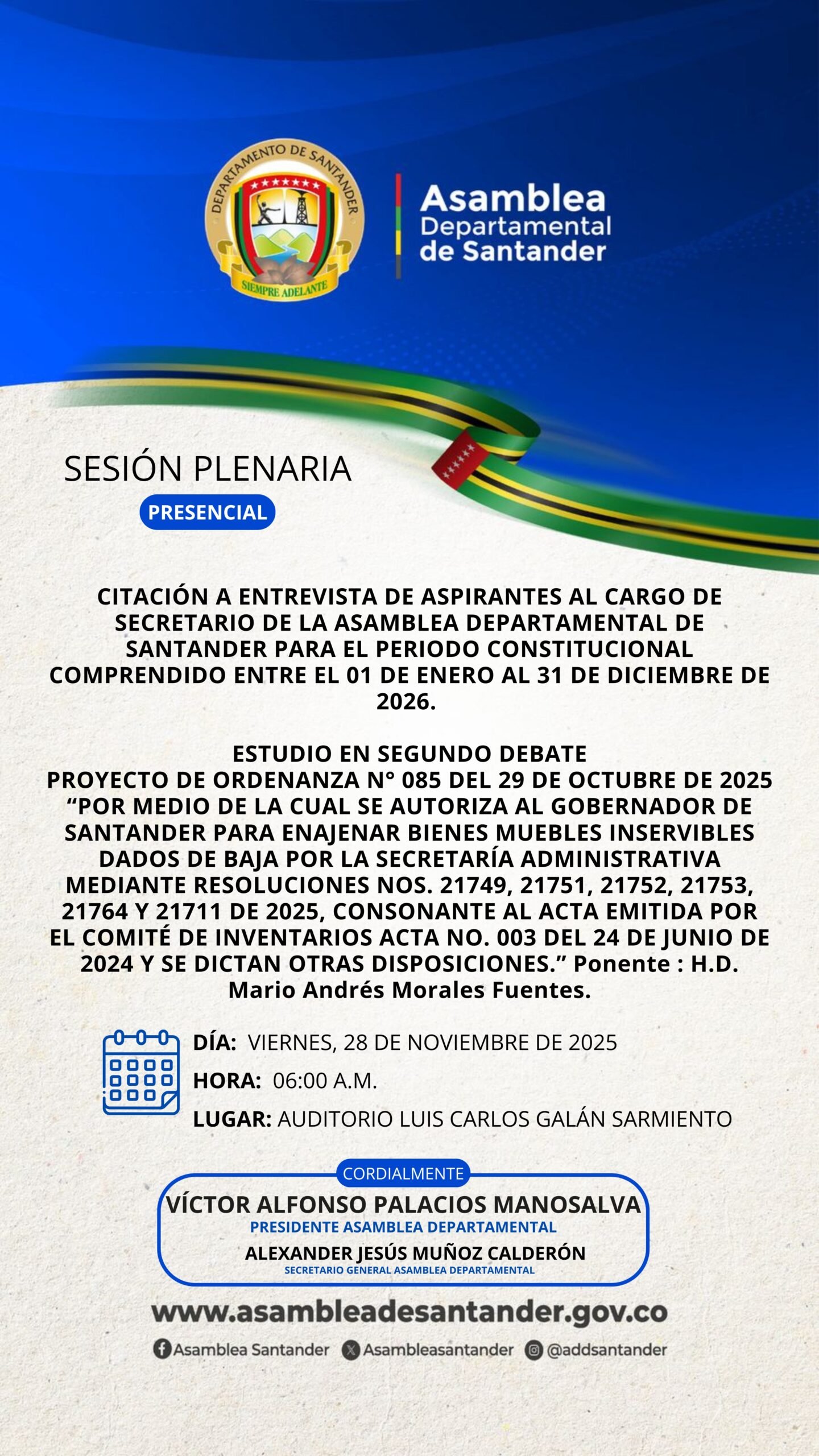 La Asamblea Departamental de Santander invita a la sesión plenaria presencial en la que se realizará la citación a entrevista de los aspirantes al cargo de Secretario de la Asamblea para el periodo constitucional del 1 de enero al 31 de diciembre de 2026, y se llevará a cabo el segundo debate del Proyecto de Ordenanza N.º 085 del 29 de octubre de 2025, mediante el cual se autoriza al Gobernador de Santander a enajenar bienes muebles inservibles dados de baja por la Secretaría Administrativa, conforme a las resoluciones y actas mencionadas. La sesión se realizará el viernes 28 de noviembre de 2025 a las 6:00 a. m. en el Auditorio Luis Carlos Galán Sarmiento.