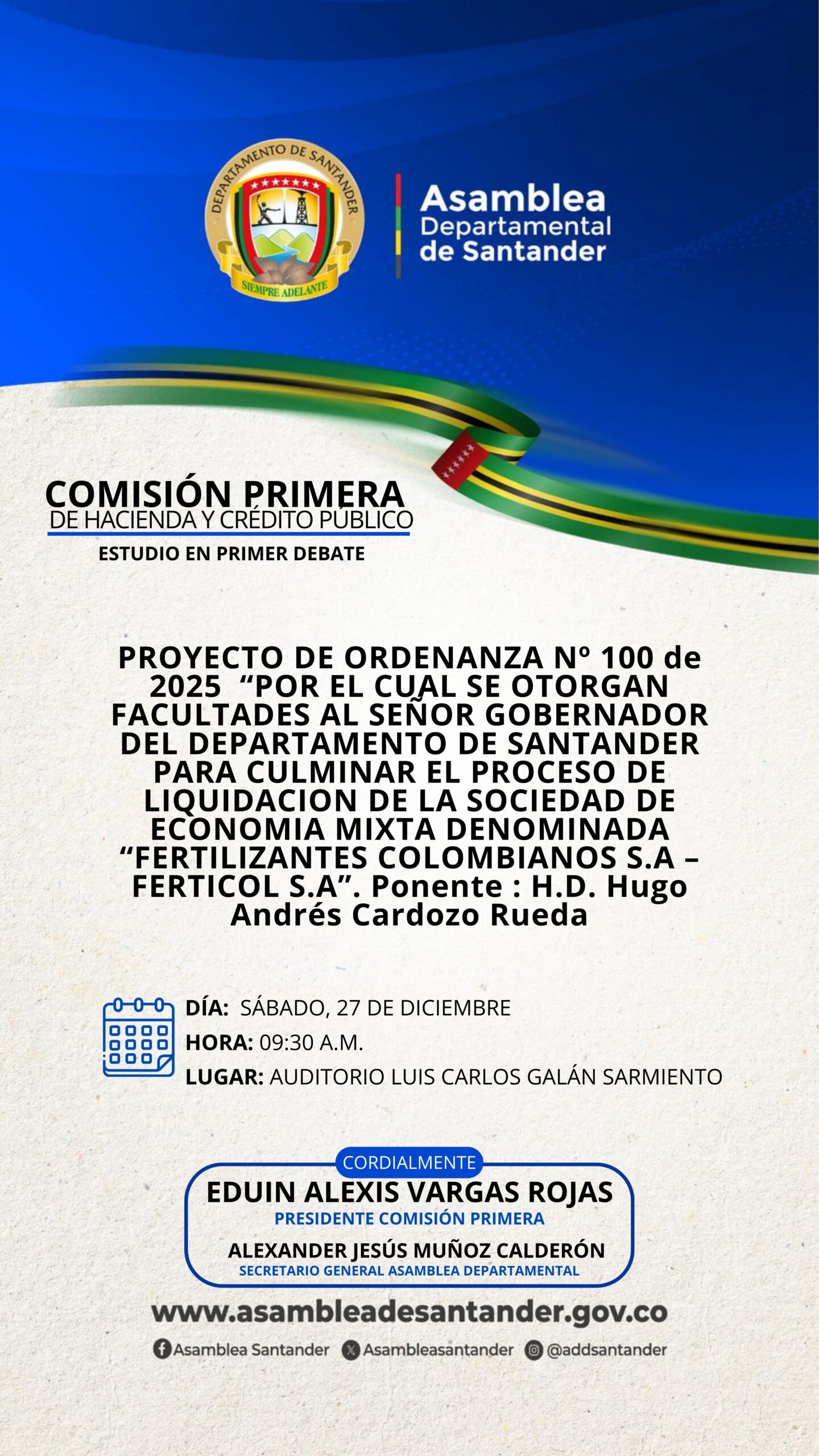 Auditorio Luis Carlos Galán Sarmiento Calle 37 # 10-36, BucaramangaLa Comisión Primera de Hacienda y Crédito Público de la Asamblea Departamental de Santander invita cordialmente a participar en el estudio en primer debate del Proyecto de Ordenanza N.° 100 […]