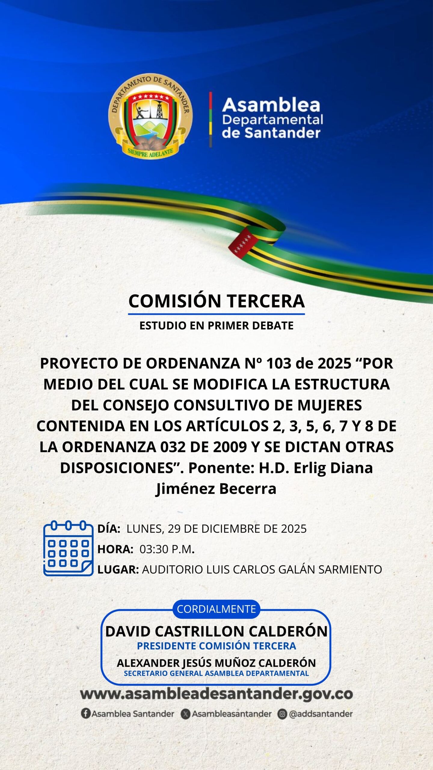 La Asamblea Departamental de Santander invita a la ciudadanía a participar en la sesión de la Comisión Tercera, donde se realizará el estudio en primer debate del Proyecto de Ordenanza […]