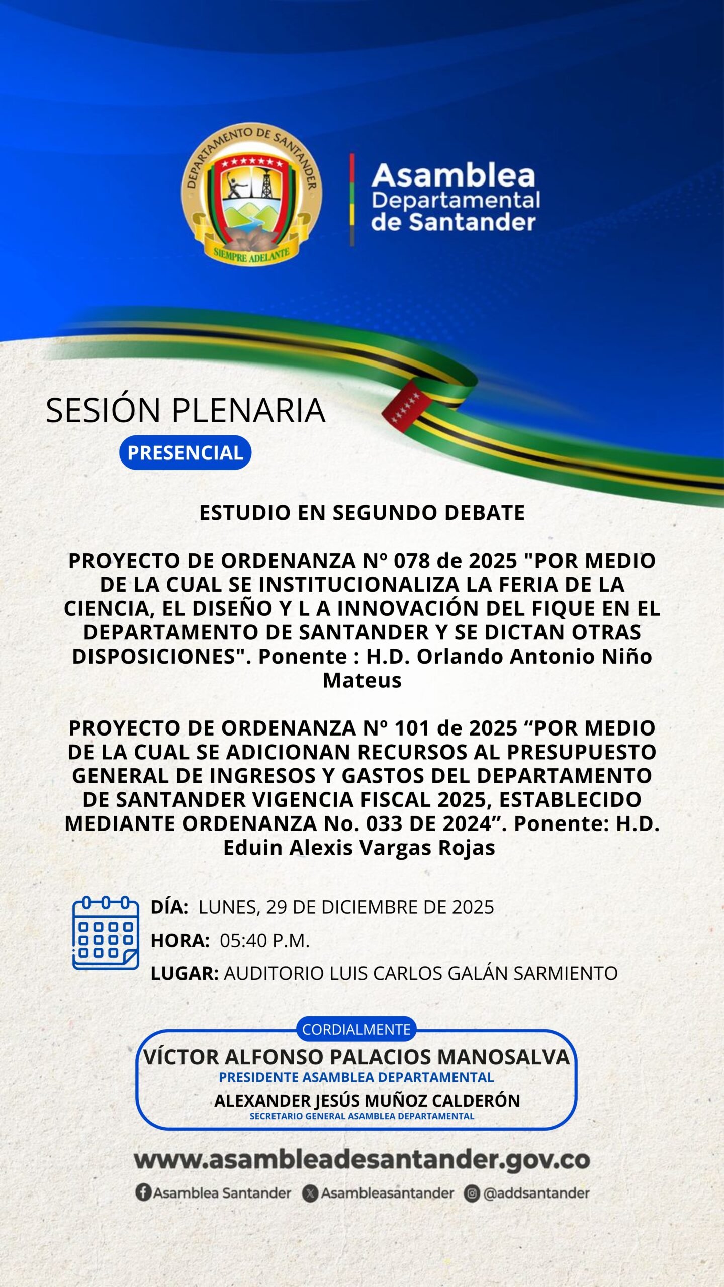 La Asamblea Departamental de Santander convoca a la sesión plenaria presencial para el estudio en segundo debate de los Proyectos de Ordenanza N.° 078 de 2025, mediante el cual se […]