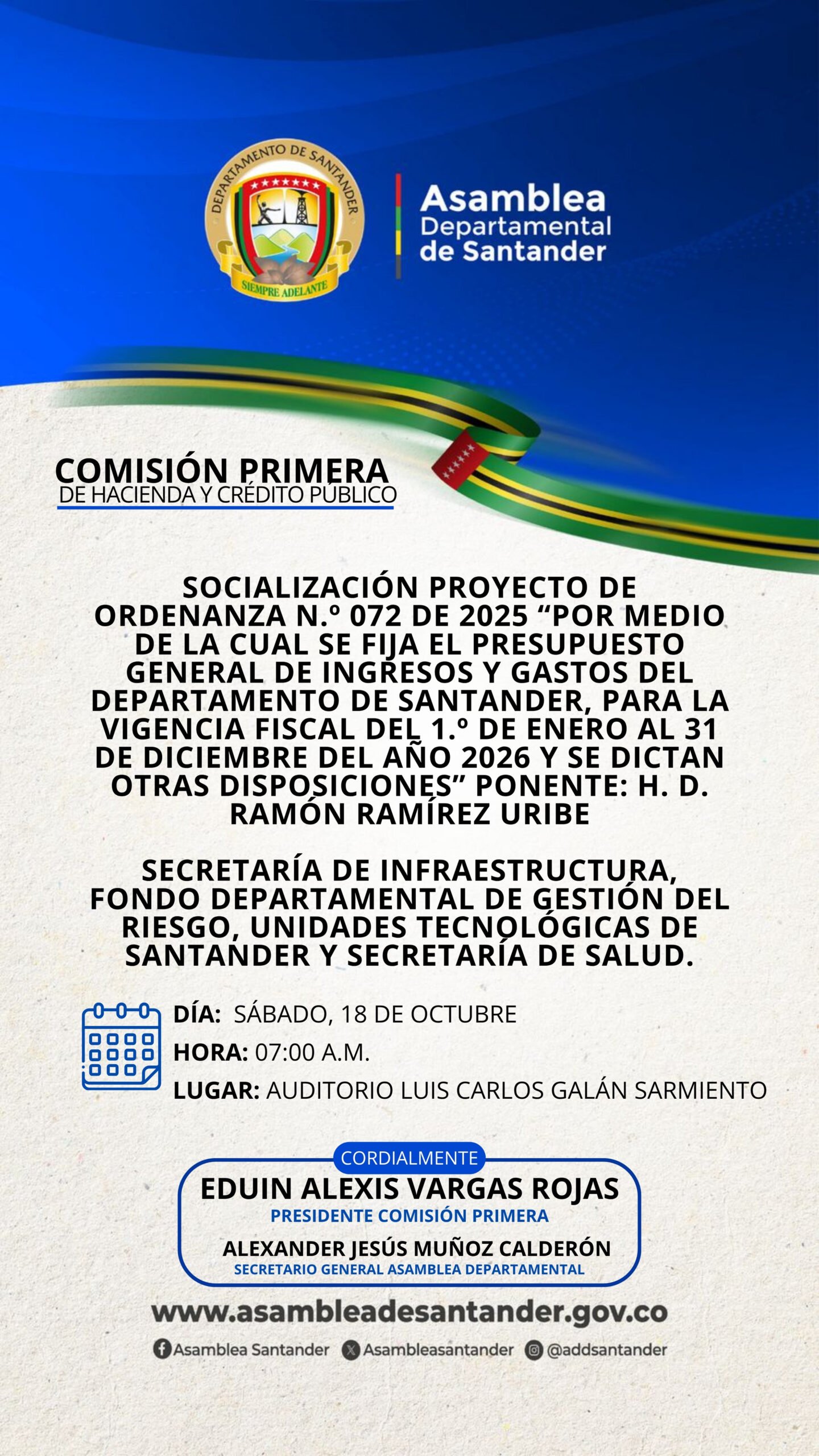 Auditorio Luis Carlos Galán Sarmiento Calle 37 # 10-36, Bucaramanga, Santander, ColombiaLa Asamblea Departamental de Santander invita cordialmente a la Sesión Plenaria presencial en la que se realizará la socialización de la problemática de deslinde en campo del límite territorial entre […]